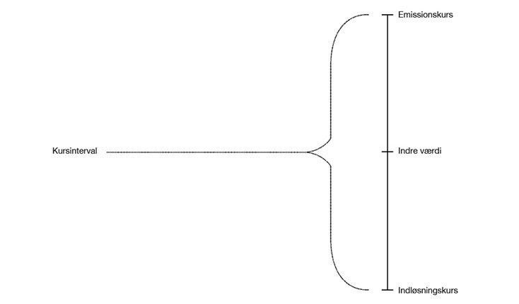Figuren viser, i hvilket interval kursen på et investeringsbevis kan ligge i forhold til indre værdi. Er der flere købere end sælgere, er fonden i emission, og handelskursen vil ligge mellem indre værdi og emissionskursen. Omvendt kan købskursen være lavere end indre værdi, hvis der er flest sælgere.