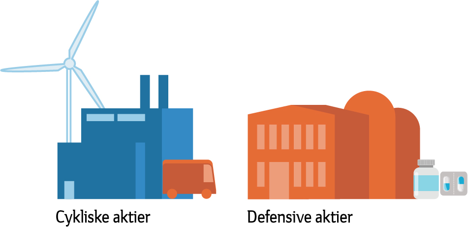 Alt efter den økonomiske situation kan det være fornuftigt at lægge sig i den ene eller den anden branche. Går det fremad i økonomien, og er finansmarkederne midt i et godt opsving, er der nogle sektorer, som klarer sig bedre end andre, mens de samme brancher typisk klarer sig ringere, hvis økonomien er på vej ned i gear. Aktier inden for sundhed og stabilt forbrug karakteriseres ofte som defensive aktier. Det gælder eksempelvis aktier i Kraft Heinz. Det vil sige, at de er relativt ufølsomme over for bevægelser i økonomien. Omvendt klarer sektorer som industri og finans sig godt, når økonomien kører derudad. De betegnes som cykliske sektorer. Et godt eksempel på cykliske aktier er aktier i Vestas, FLSchmidt og DSV.