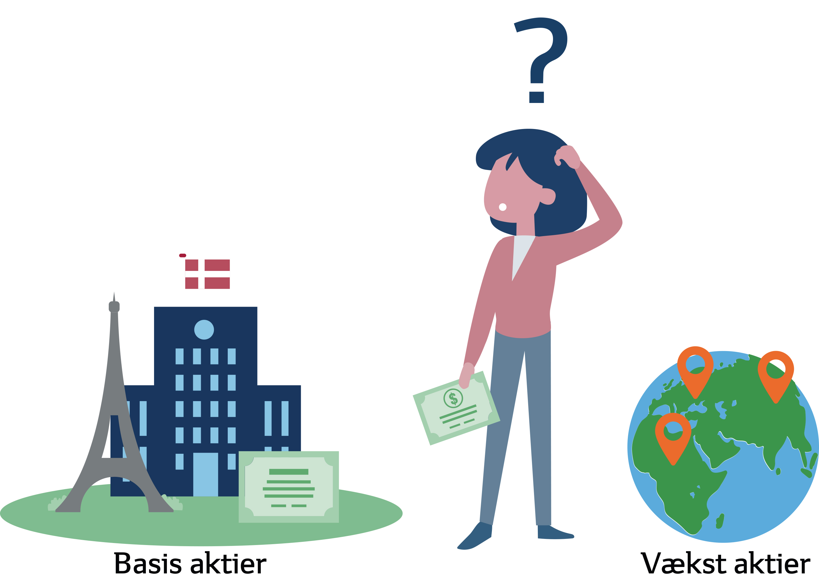 - Basisaktiefonde investerer bredt i danske, europæiske og globale aktier og har stor risikospredning.