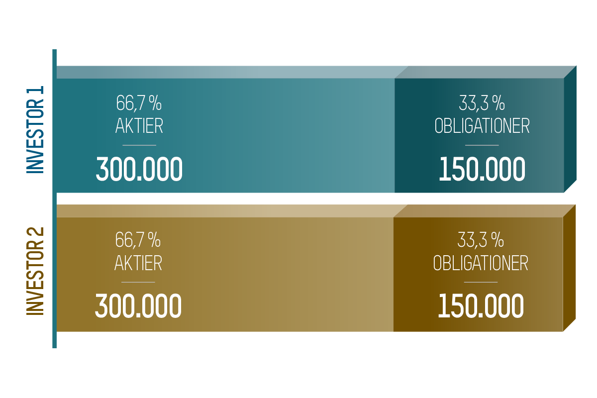 To fiktive investorer ønsker hver især at investere 300.000 kr. i en portefølje bestående af 50 % aktier og 50 % obligationer. Den ene investor (Investor 1) ønsker ikke at rebalancere sin portefølje, mens den anden (Investor 2) rebalancerer sine vægte i aktier og obligationer løbende, så de fastholdes på 50/50.