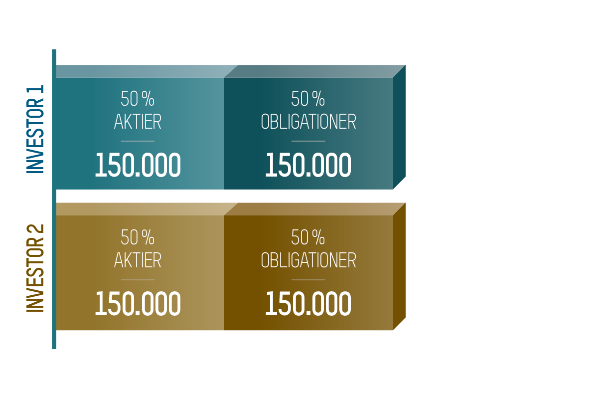 Den ene investor foretager sig ikke noget, mens den anden investor rebalancerer sin portefølje, så aktier og obligationer igen fylder 50 % hver.